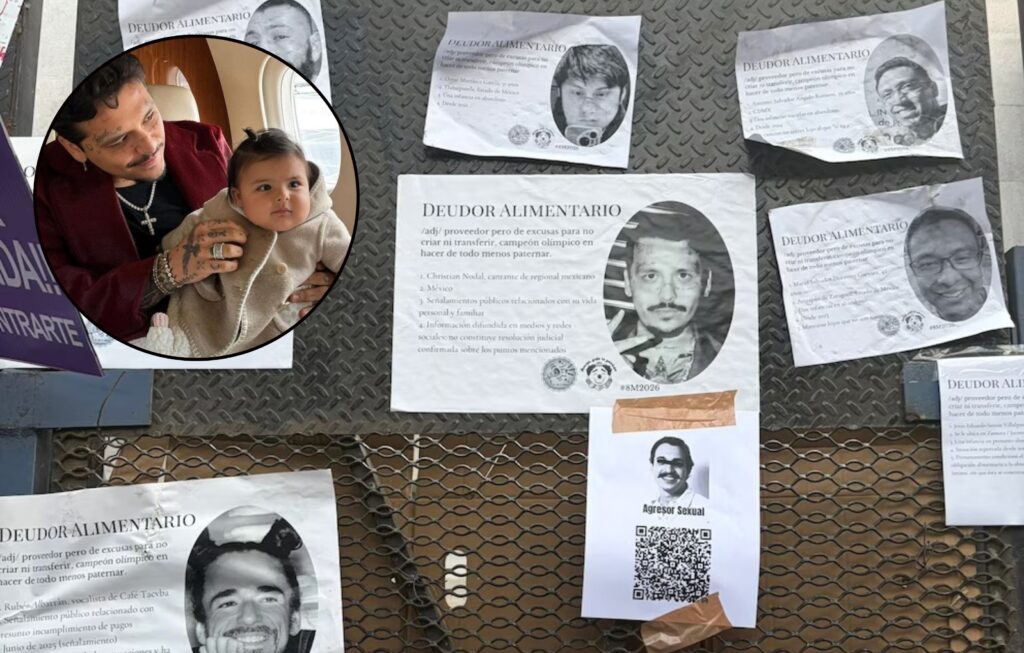 Christian Nodal apareció en uno de estos espacios con su fotografía y la leyenda “deudor alimentario”. Según colectivos asistentes, se le acusó de no cumplir cabalmente con la pensión alimenticia de su hija Inti, fruto de su relación con la cantante argentina Cazzu.